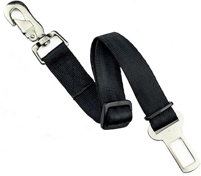 Ensure your dog's safety during car trips by attaching one end of a pet seat belt to the vehicle's seat belt buckle and the other end to your dog's harness.